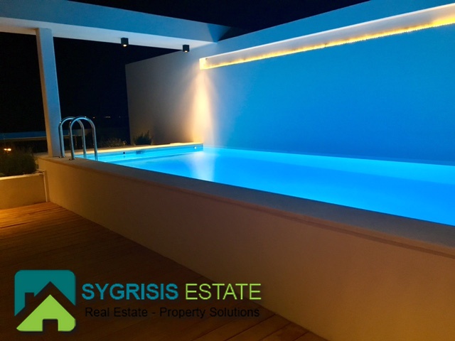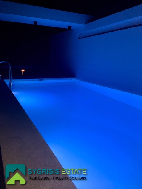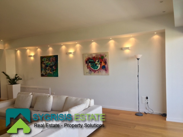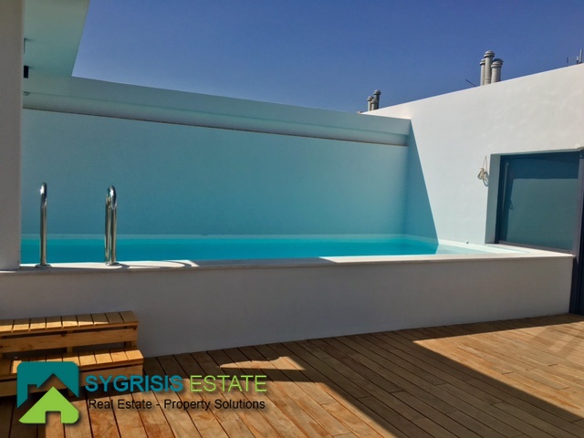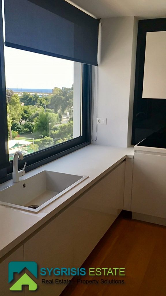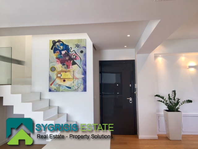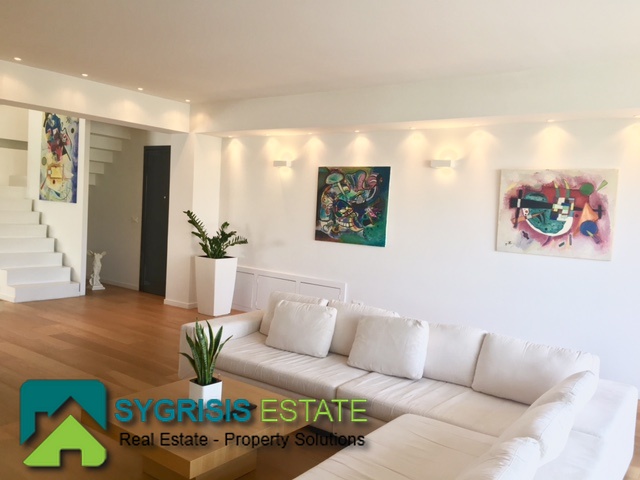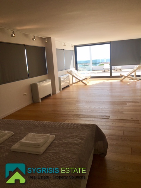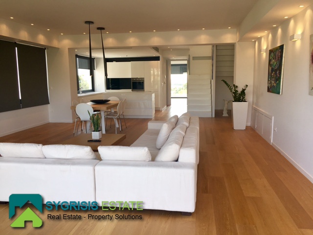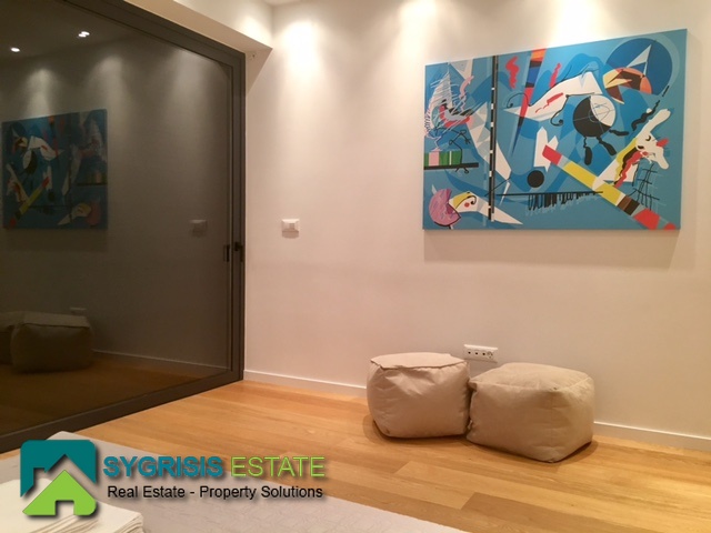 ATHENS Hellinikon , newly constructed maisonette 215 m², third and fourth floor,frontage and dual aspect, 4 bedrooms (2 master), construction 2015, 3 bathrooms, 1 wc, furnished, living room, dining kitchen, heating, gas, Air conditioning, security door, mountain – sea view, underground parking, storage, garden, swimming pool, energy class A +, large terraces, oak floors throughout the house, energy efficient aluminum window frames with double glazing and shutters, Fan coil Autonomous Underfloor heating, with elevator and sea view, 3 parking spaces in the basement, large storage room and independent room with bath service and kitchen in the basement, outdoors on the 4th floor there is a heated swimming pool with sea view and large planted flower space, security alarm system, video intercom.