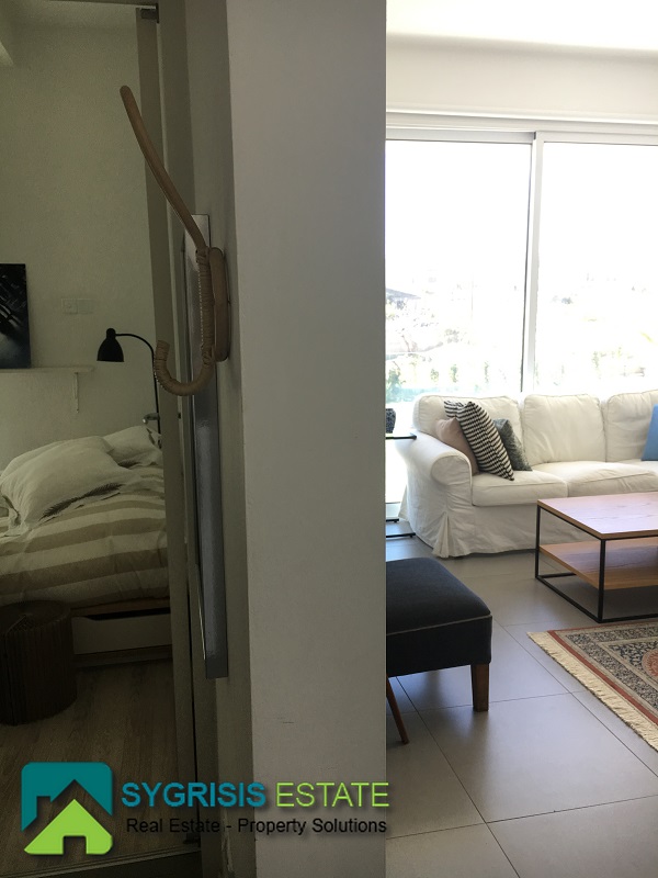Cyprus, Limassol, Mesa Gitonia, apartment 65 sqm, construction 2012, 1st floor, frontage and dual aspect apartment, hallway, open plan kitchen with the living room, 1 bedroom, 1 bathroom, autonomous heating, air conditioning, solar water-heater system, security door, sliding aluminum window frames with double glazing and roller shutters, granite tile floors in living room kitchen and laminate in bedroom, large covered balcony, fully furnished and equipped, ergonomic cabinets in the kitchen with built-in kitchen cooker with ceramic hobs and oven, built-in fridge, stainless steel sink, large wardrobe in the bedroom, closed parking by remote control, storage room.