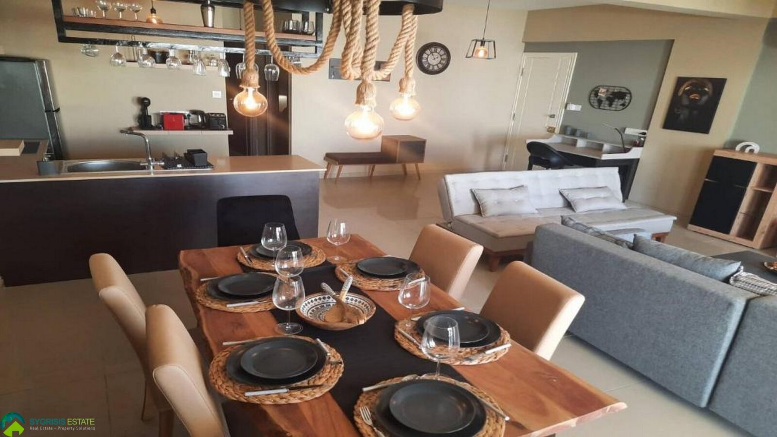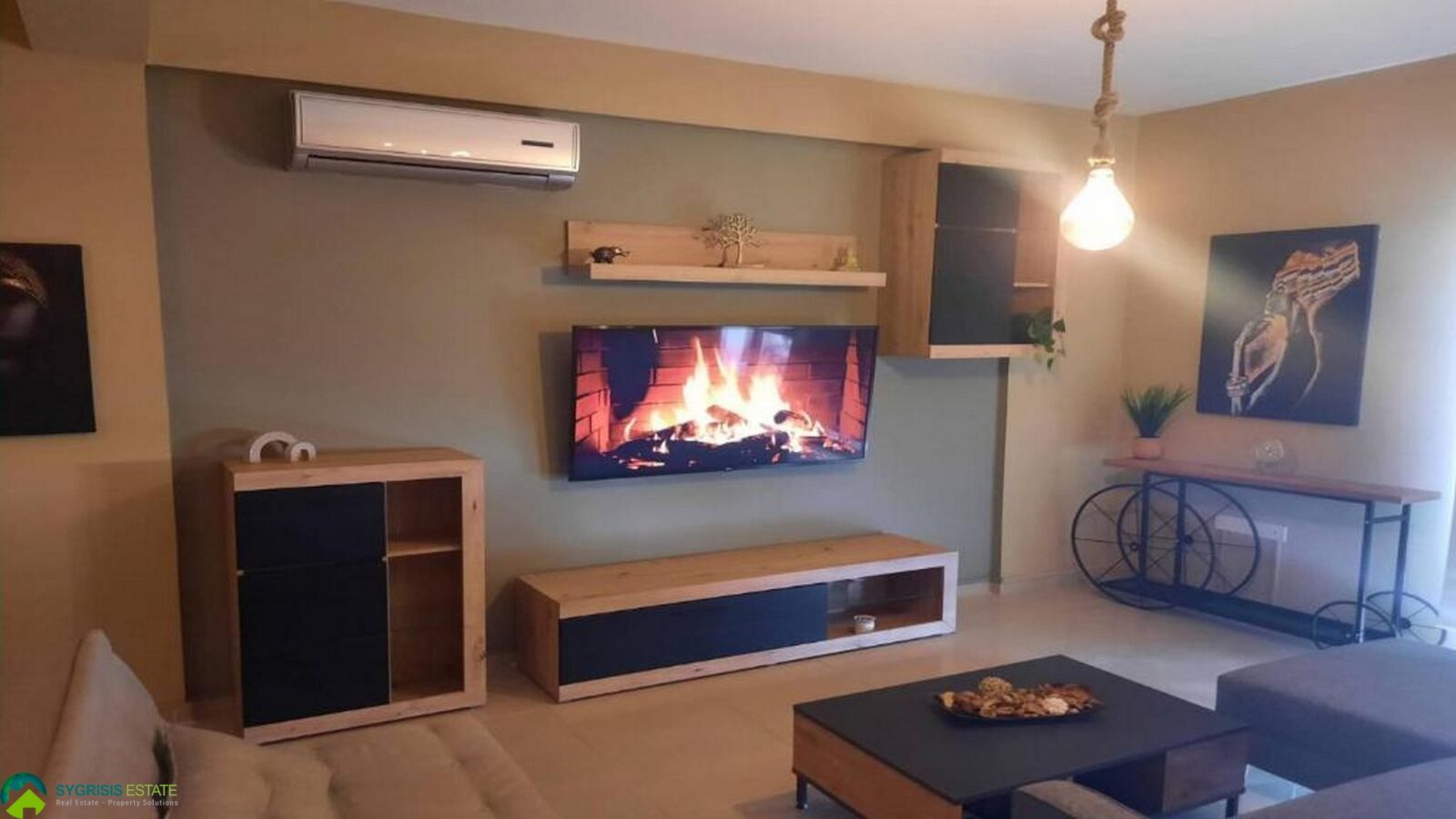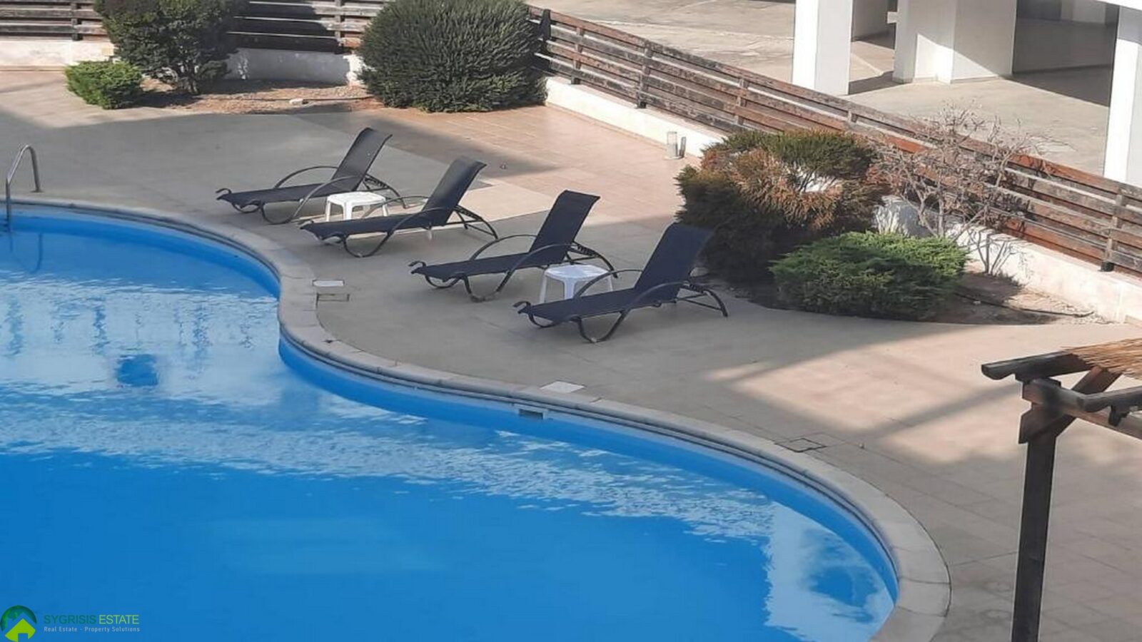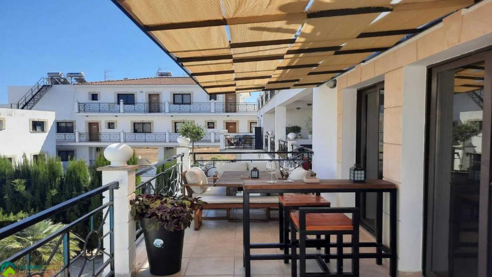 Cyprus, Larnaca, Tersefanou: Apartment 87 sq.m., fully renovated, bright, with an excellent layout, fully furnished and equipped. It features 2 bedrooms, 1 bathroom with a bathtub, an open-plan kitchen with living room and dining area, and a 15 sq.m. front veranda covered with a pergola. The property includes a private covered parking space, access to a communal swimming pool and tennis court, a security door, air conditioning, tiled flooring throughout, energy-efficient aluminum window frames with double glazing, ergonomic kitchen cabinets, and large built-in wardrobes in the bedrooms.