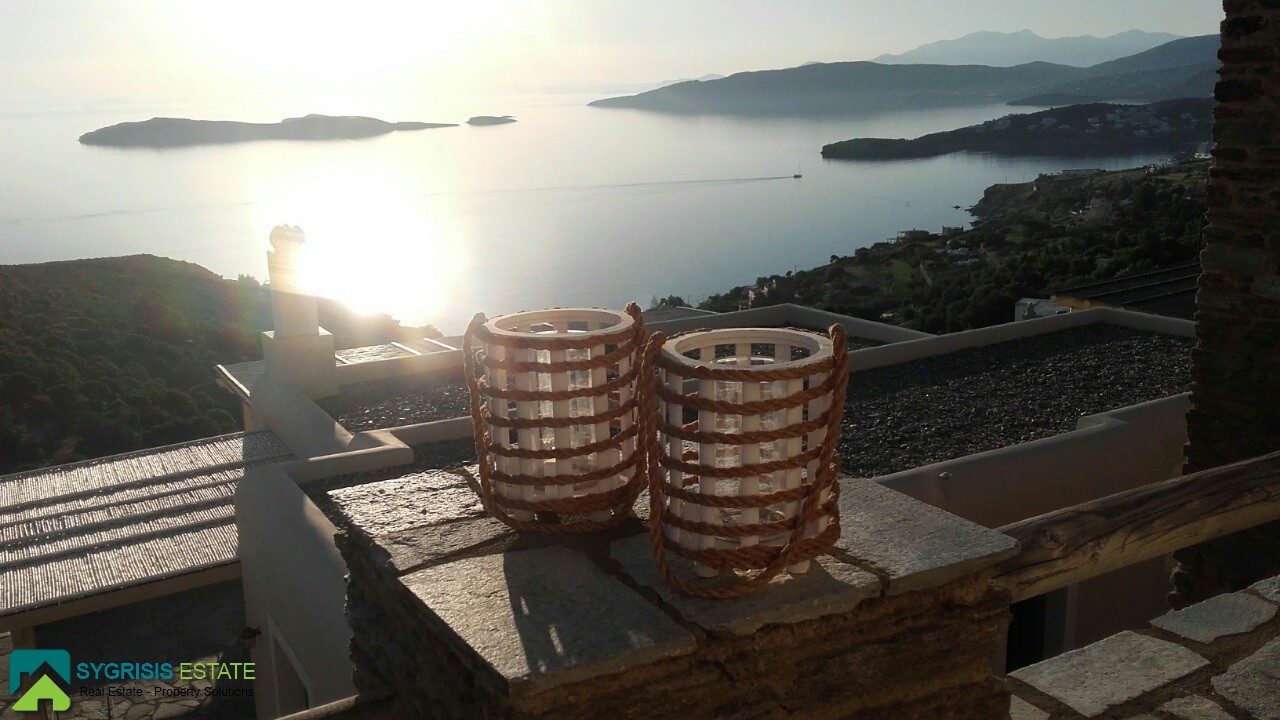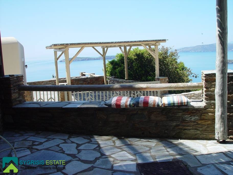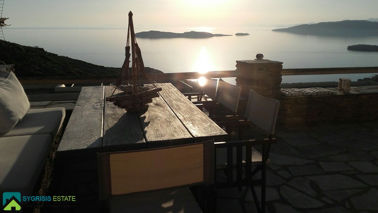 CYCLADES ANDROS, KOUTSI, Newly built traditional, stone, Detached House of 240 sq.m., constructed in 2009, ground floor – 1st, facade, dual aspect, bright, excellent layout, 4 bedrooms (2 master), 3 bathrooms, 1 wc, 2 living room with dining area, 2 kitchen, autonomous heating with heating oil, air conditioning, fireplace, security door, solar water heater system, open parking, storage room, garden, fully furnished and equipped, floor tiles, energy efficient aluminum window frames with double glazing and shutters, kitchens with ergonomic design many cabinets and stainless steel sinks, large wardrobes in the bedrooms, large verandas on the facade with access to them from all rooms, with breathtaking views of the Aegean Sea and the sunset, on a main road leading in to 2 km in the town of Batsi, the house operates at Airbnb as two separate accommodations with the possibility of hosting up to seven people each with a very high occupancy rate, a wonderful investment proposal.