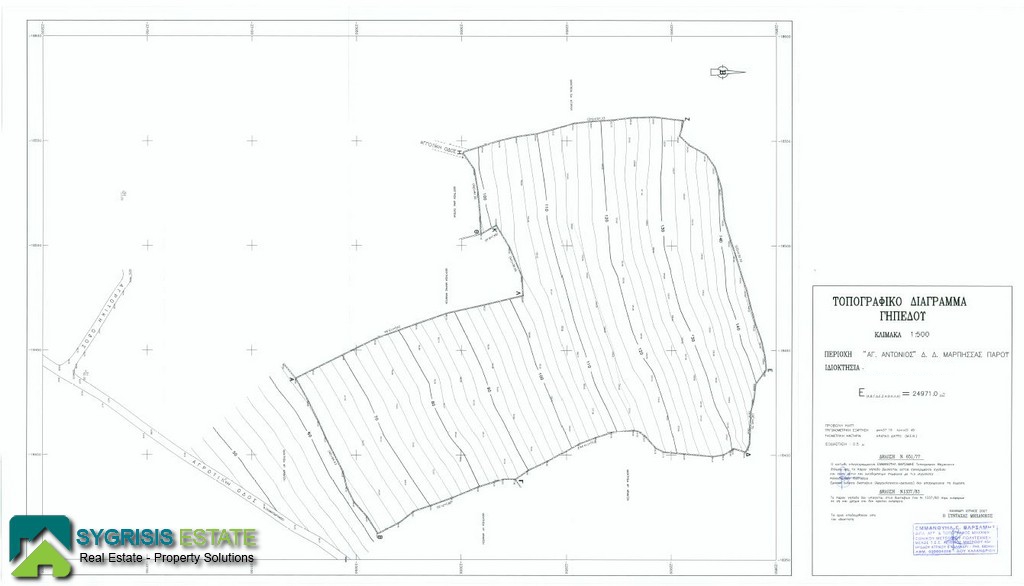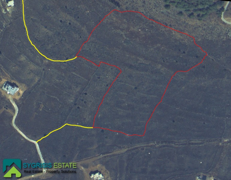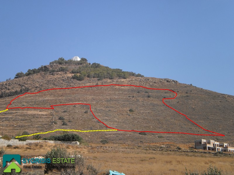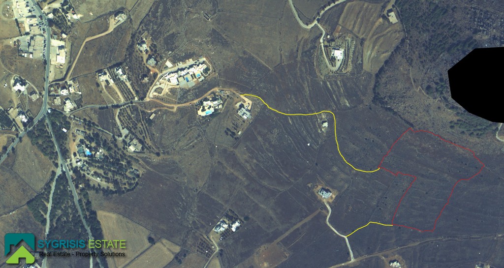 CYCLADES ISLANDS PAROS Agios Antonios Marpissas (Kaminaki), plot of 24.971 sq.m., out of plan, inclined, buildable, permit to build 183.5 sq.m., 227 meters from sea, unlimited sea view, A’ archaeological zone 15.571 sq.m. (15,6 acres), B’ archaeological zone 9.400 sq. m. (9,4 acres). The A’ archaeological zone cannot built, the B’ archaeological zone it is buildable, it builds 183,5 sq. m. (House of 163,5 sqm + auxiliary building (garage, storage) 20 sq. m. and height 2,5 m) in the aerial photographs, the boundaries of the plot are highlighted in red and, with a yellow interrupted line, the access roads that can be opened (registered in the Marpissa community) are accepted and exchanged with properties of equal or similar value in Vrilissia and Halandri.