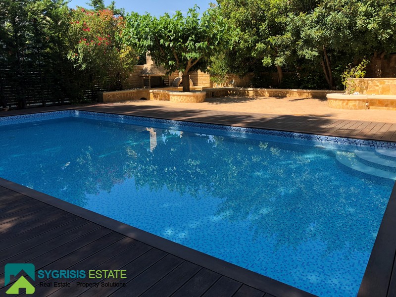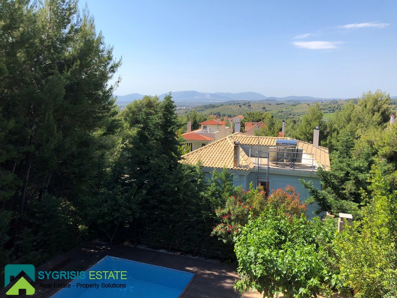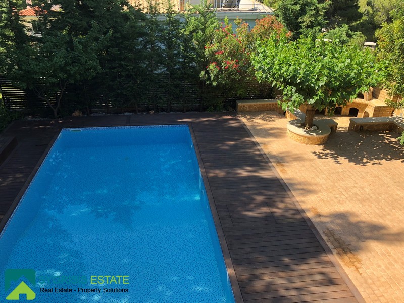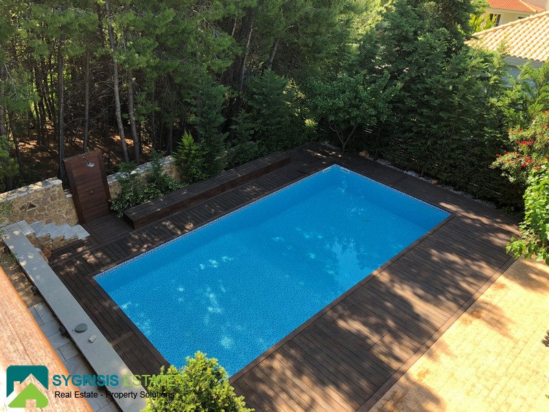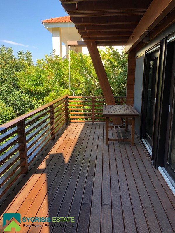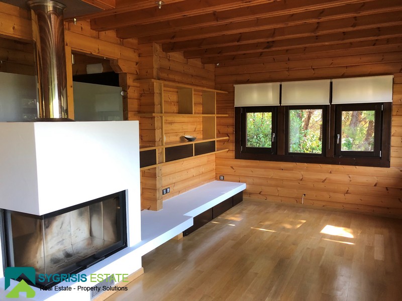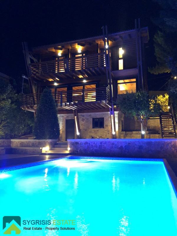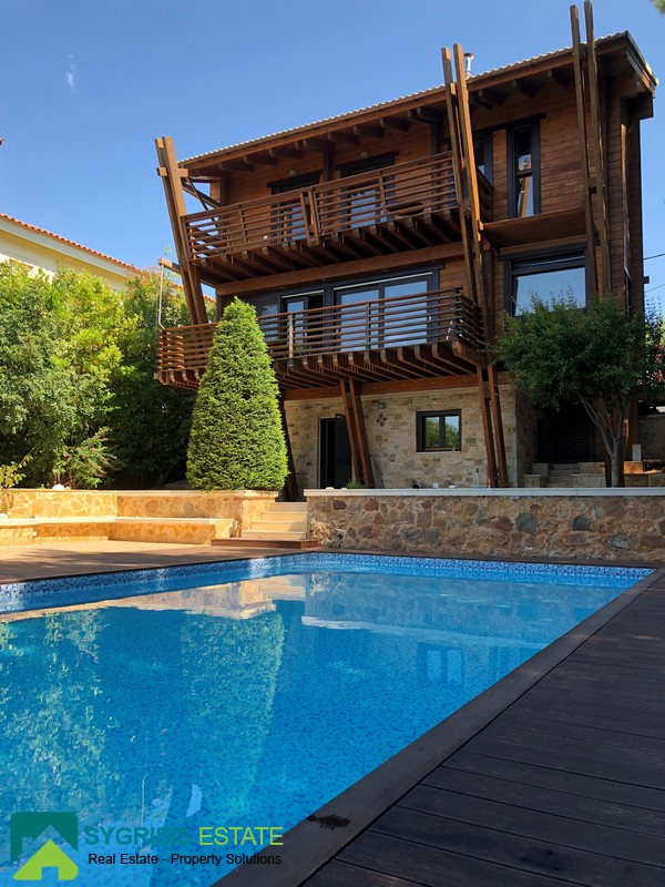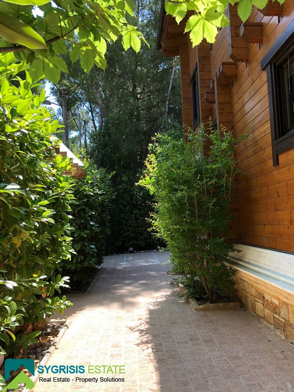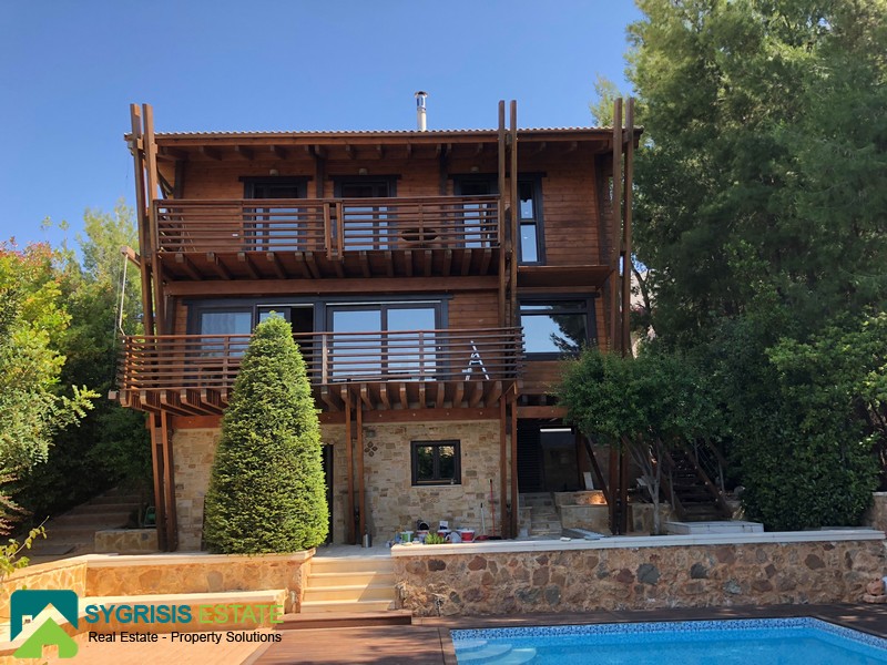ATHENS Pikermi, Dioni, Luxury Finland’s Wooden three-storey house bioclimatic architecture of 165 sq.m., in a plot of 501 sq.m., constructed in 2009 , it is a frontage and dual aspect house, bright, excellent layout, 3 bedrooms, 3 bathrooms, 2 kitchens, 2 living rooms, the development consists of an independent stone-built apartment of 45 sq.m. on the ground floor and a wooden two-storey 120 sq.m., security doors, alarm security system, autonomous heating with heating oil, energy efficient fireplace, air condition, solar water heater system, wooden floors, energy efficient aluminum window frames with triple glazed windows for ultimate thermal and sound insulation, screens and shutters, ergonomic cabinets in the kitchen , large built-in wardrobes in the bedrooms, large bathrooms, swimming pool of 50 sq.m., Brick barbecue grill with oven in the garden, private parking, the house is outstanding because of its location, is situated in a green area full of pine trees overlooking the valley of the Mesogeia, 15 minutes drive to Rafina Port(9 km), 20 minutes drive to Athens International Airport (14 km), 10 minutes drive to Attica Zoo Park (5 km), 25 minutes drive to the center of Athens (21 km) and 5 minutes drive to the center of Pikermi City(3 km) which is full of bakeries, restaurants, coffee shops, commercial stores, supermarkets,kiosks, pharmacies, gyms, ATM’s, parks, bus stations, etc., located in a quiet street and peaceful safe area.