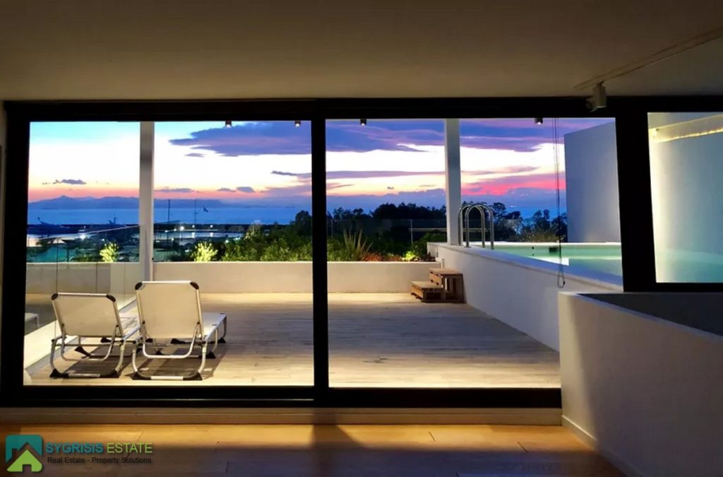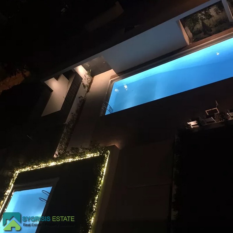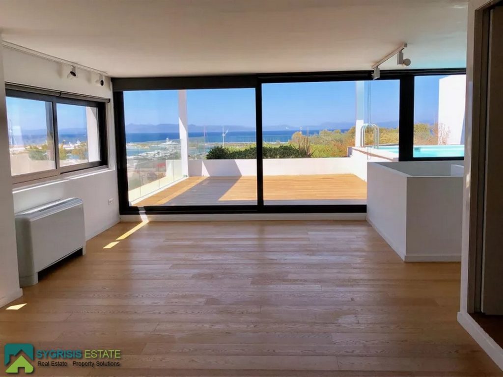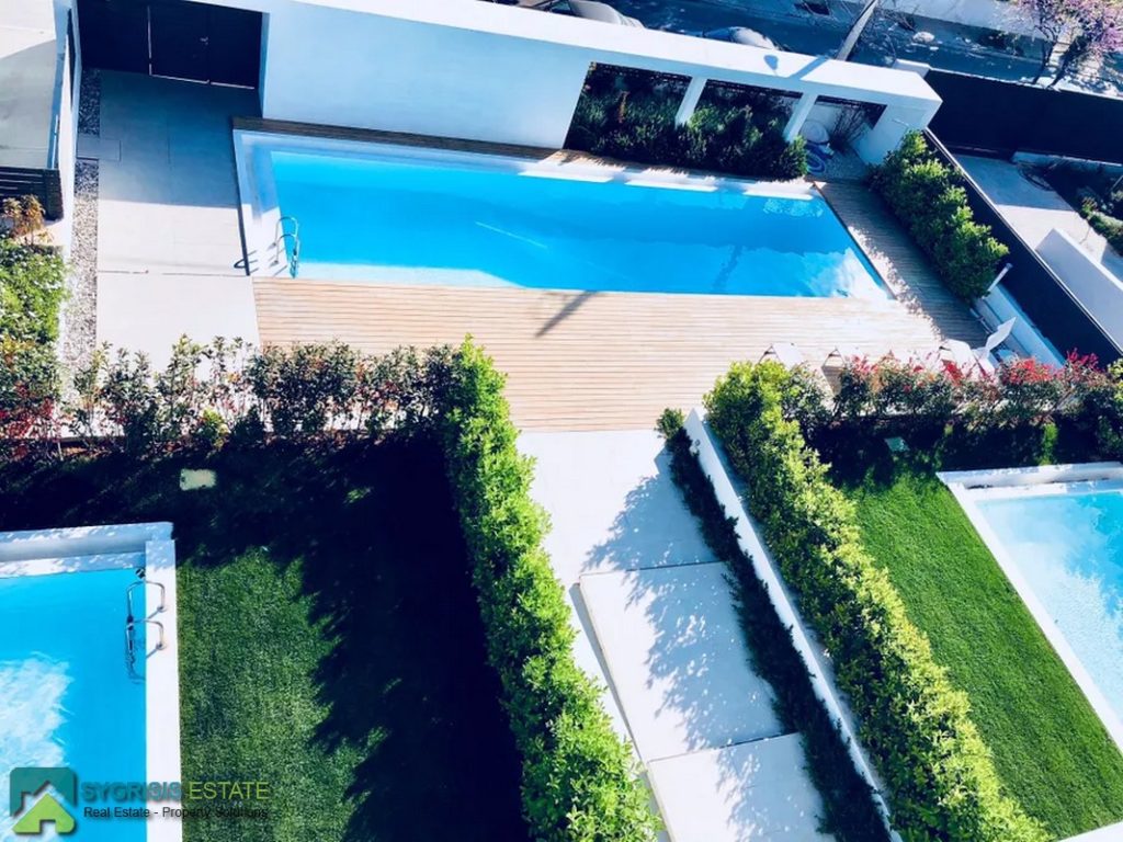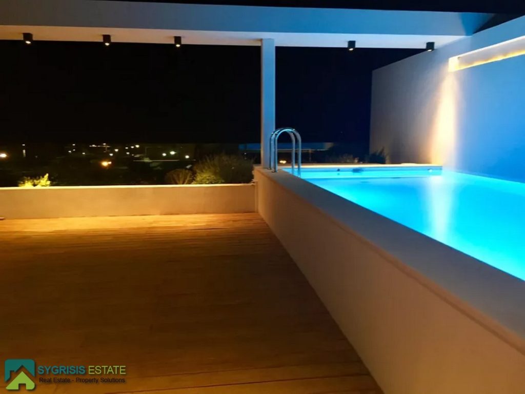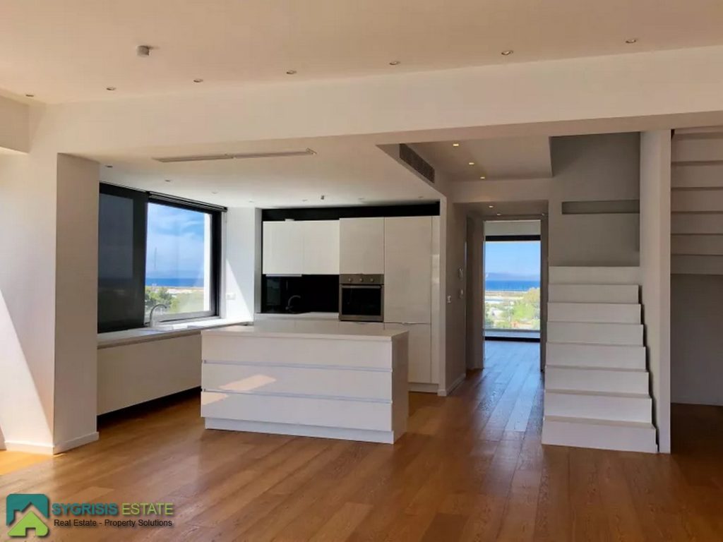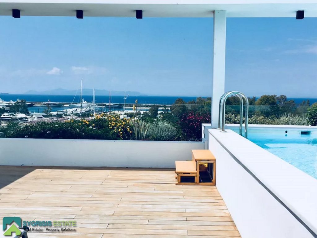 ATHENS ELLINIKO, Kato Elliniko, New Development, Luxury Penthouse Maisonette of 215 sq.m, Size of balconies: 100 sq.m., Constructed in 2017, 3rd & 4th floor with private roof garden, frontage and dual aspect, 3 bedrooms (2 master with en-suite bathrooms), 1 bathroom and 1 guest WC, open concept kitchen with the living room and dining area, autonomous underfloor heating system with natural gas, energy-efficient fireplace, central air conditioning system, solar water heater system, security door, alarm security system, entrance camera intercom, security windows, large balconies facing the Elliniko Marina and amazing sea views, underground parking for two vehicles, storage room in the basement, garden, private swimming pool, energy class A +, there is also an optional independent personnel room in the basement, Average monthly shared expenses: 90 €, Distance from sea (m): 250 meters.