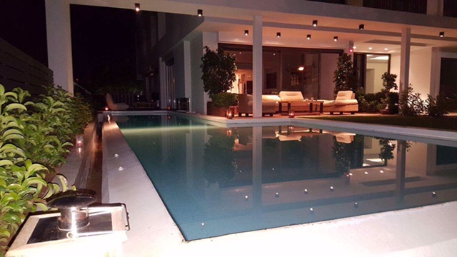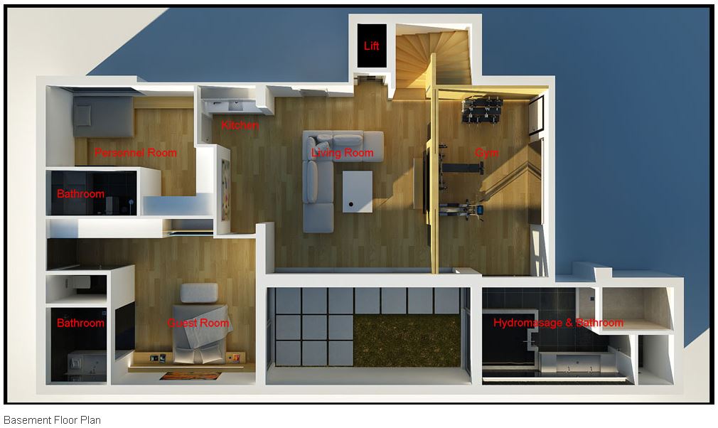 The basement floor includes 1 big master bedroom that looks onto the interior of the swimming pool through a triplex high safety glass, a Sauna and Jacuzzi room, a playroom or gym space, a master guestroom, an additional bathroom for pool guests, a laundry room and a personnel room with its own bathroom and kitchenette. The basement floor has access to a basement garden so there is ample natural light and fresh air and has access to the pool area through an exterior staircase, in addition to the internal one.