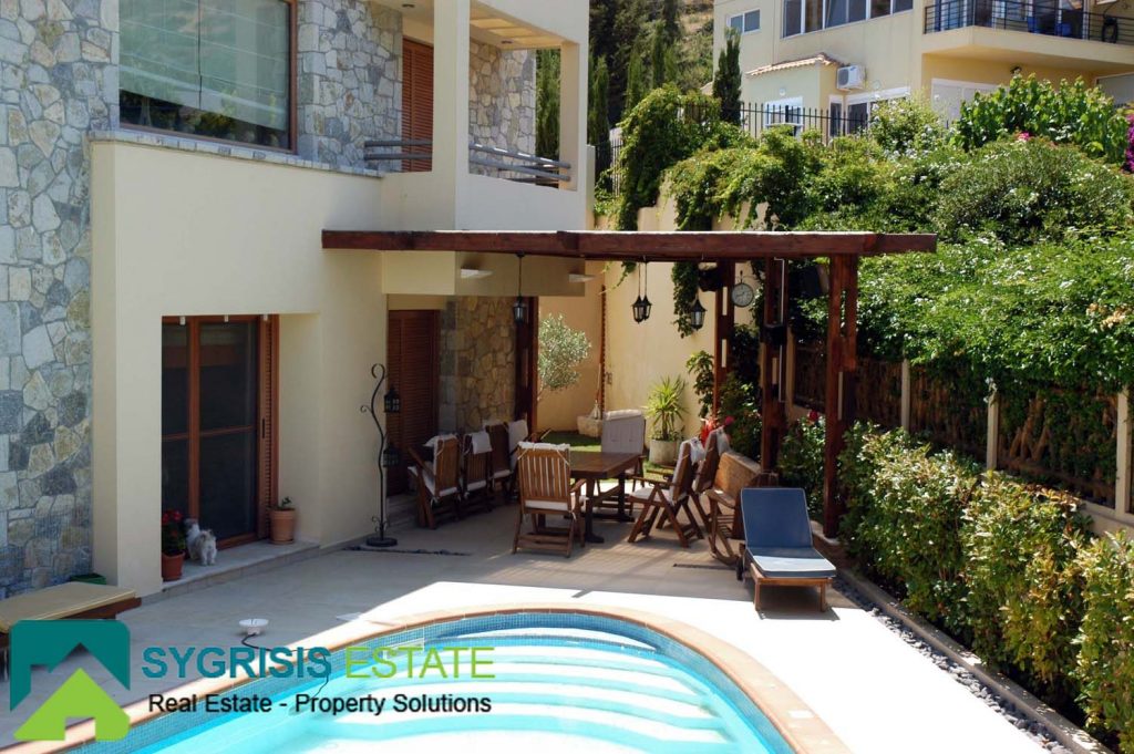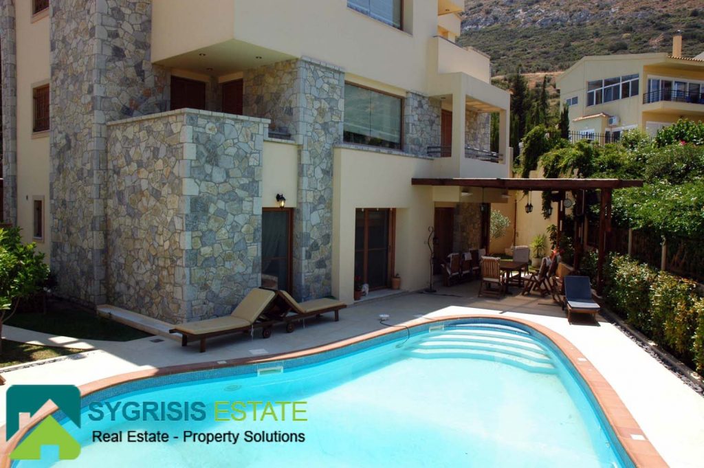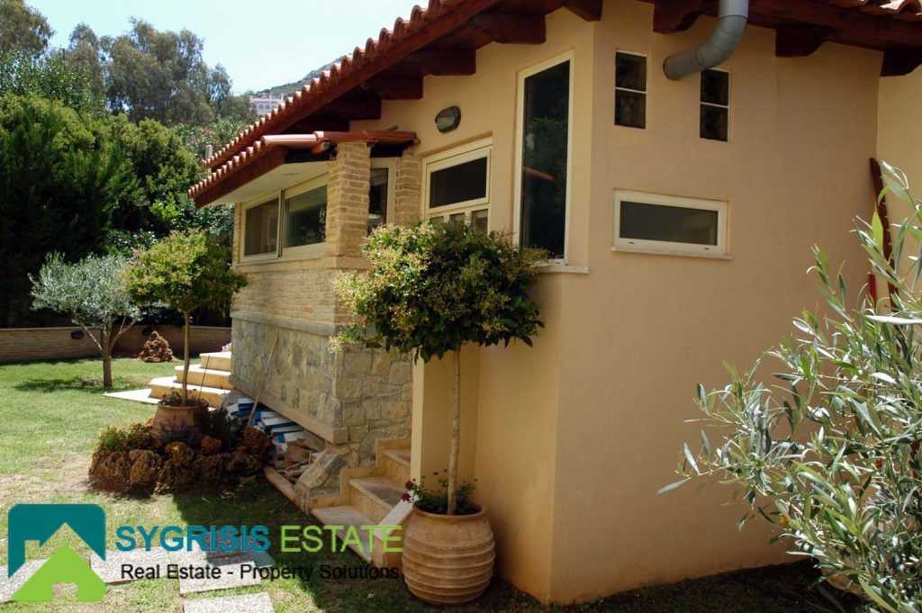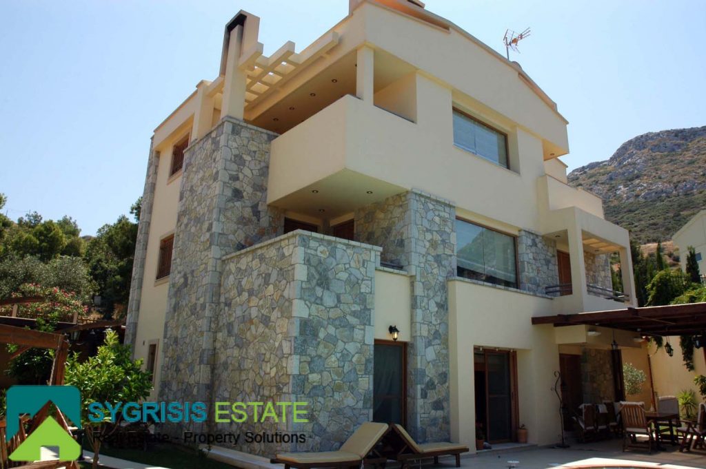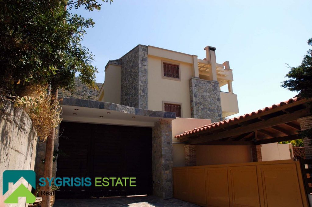 Details: The house was built by the owner himself and not by any other manufacture company. It is lined with stone, it has a handmade perimeter fence, a security door, and panoramic round view to the mountain and to the Aegean Sea. The house is in a closed, guarded seaside resort of luxury homes. It is sold fully furnished and equipped. All appliances and furniture are of the latest technology, high quality and construction.
