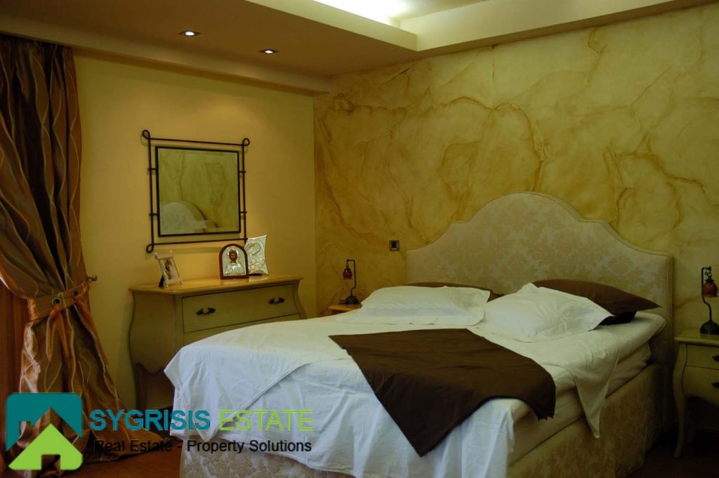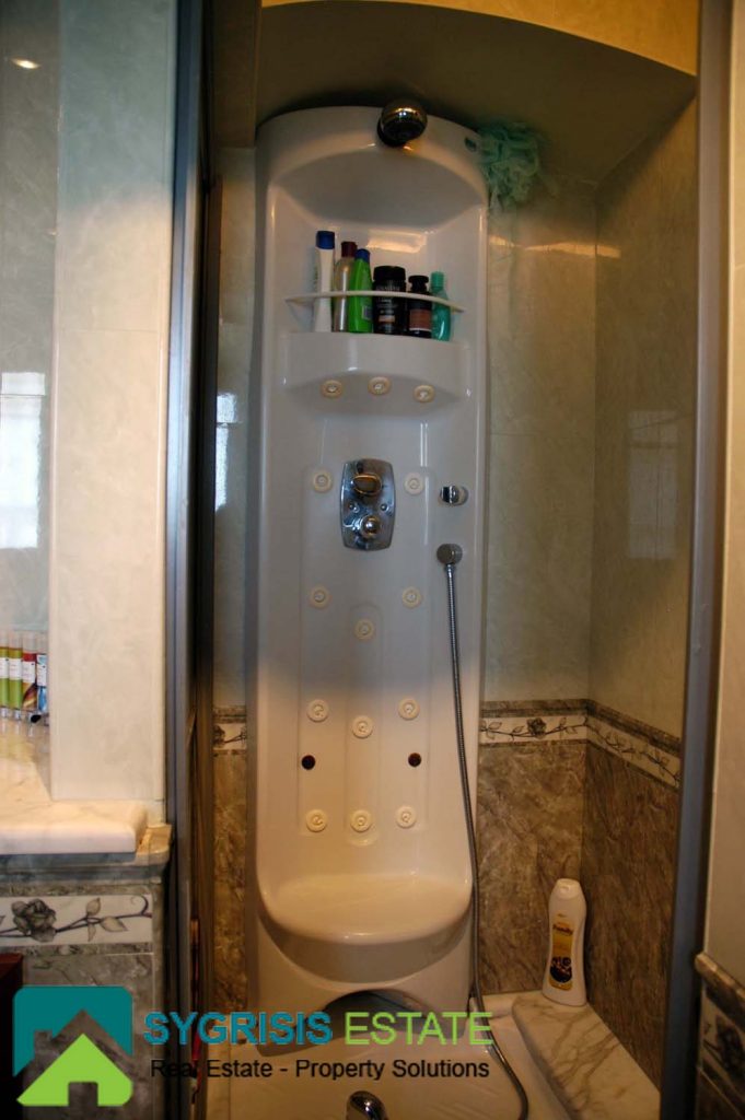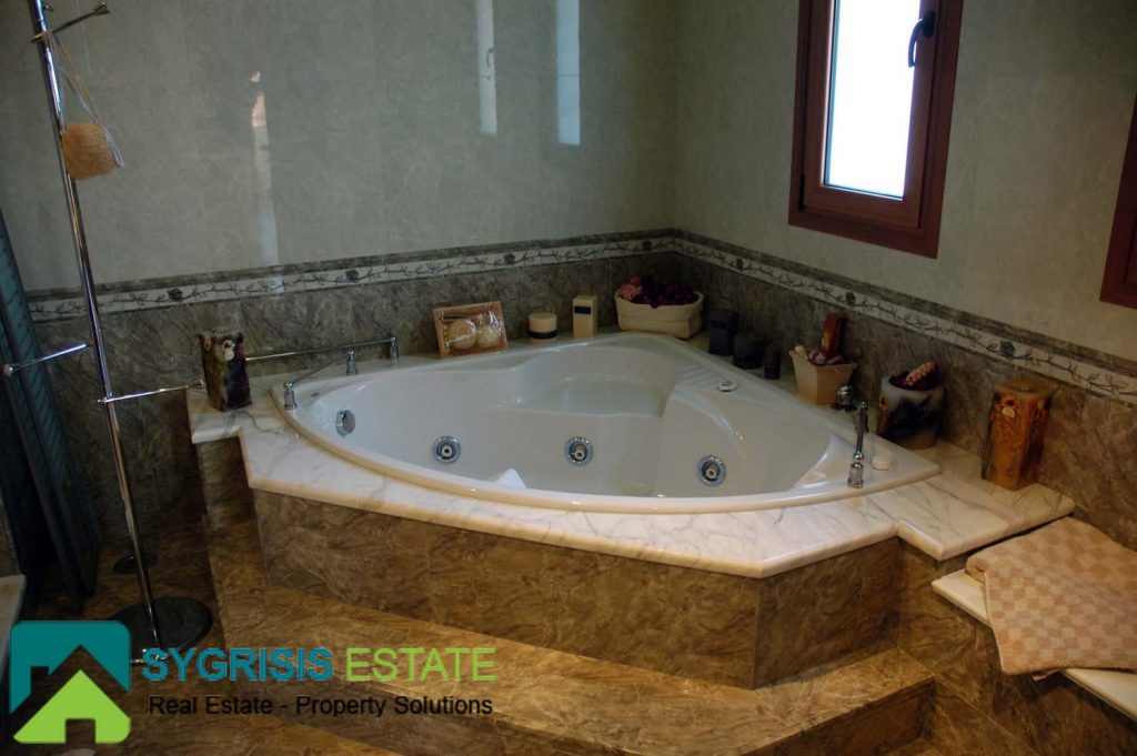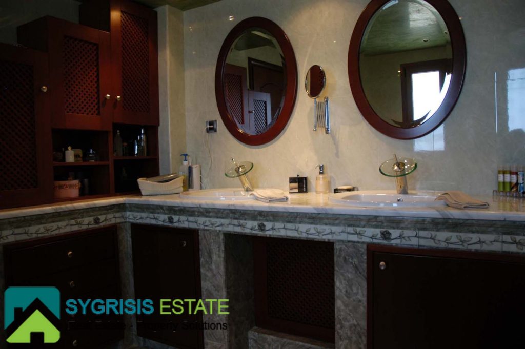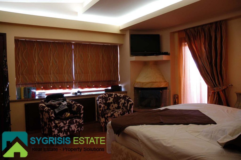 The master bedroom is one of the most unique and coziest rooms of the house. It has a big window with a great view to the Aegean sea, seen from the max size double bed. It also has two big balconies at the two front corners, both with a view to the sea. A warm fireplace is also located in it. More than that, it also has a big closet and a private bathroom. The bathroom has many store cabinets, two washbasins, a big round whirlpool bath and a whirlpool douche.