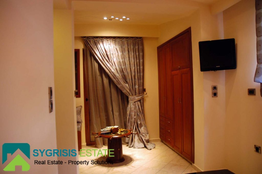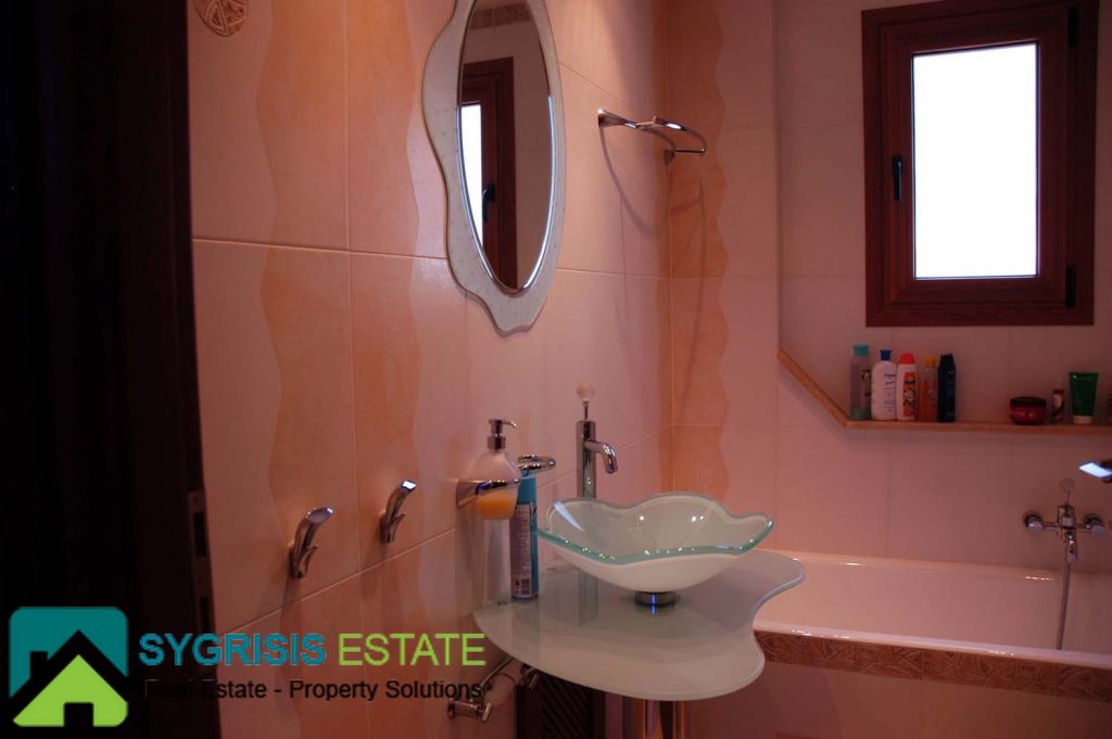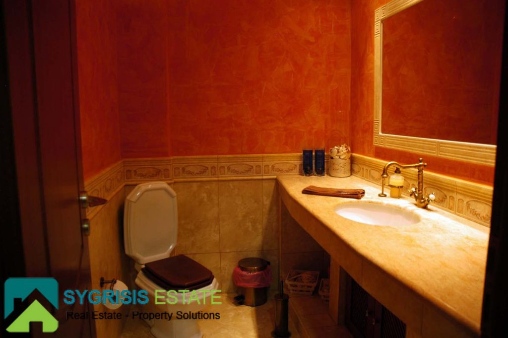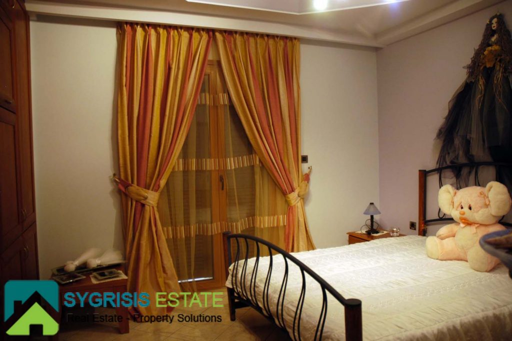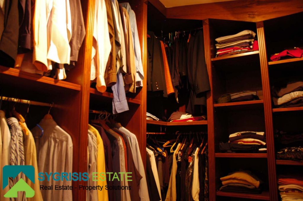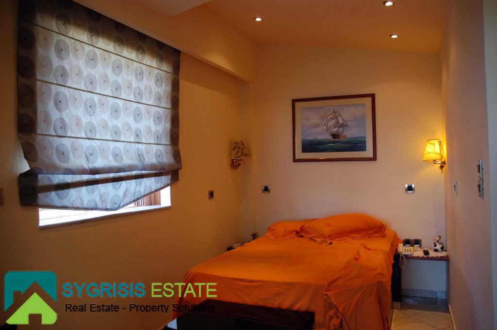 The master bedroom is one of the most unique and coziest rooms of the house. It has a big window with a great view to the Aegean sea, seen from the max size double bed. It also has two big balconies at the two front corners, both with a view to the sea. A warm fireplace is also located in it. More than that, it also has a big closet and a private bathroom. The bathroom has many store cabinets, two washbasins, a big round whirlpool bath and a whirlpool douche.