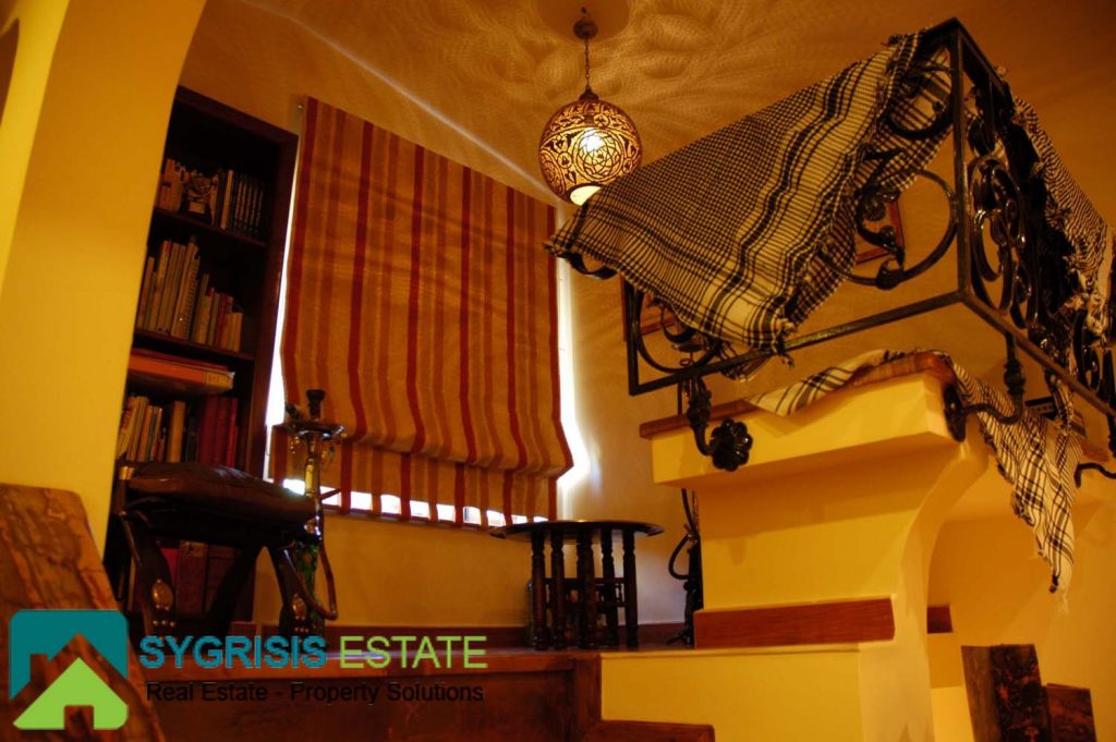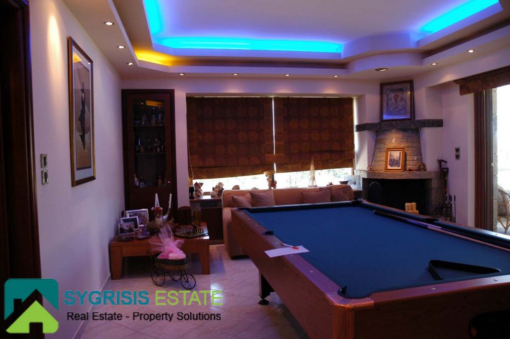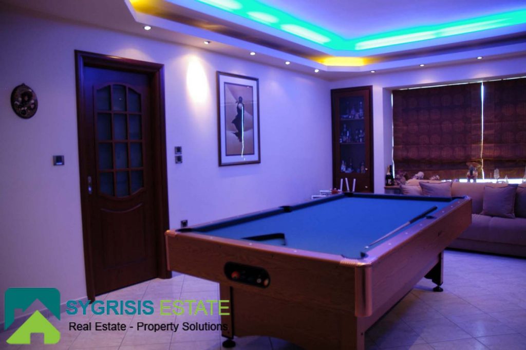 The playroom located on the second floor is a wonderful room that offers entertainment and relaxation hours to the residents. The guest house and the two bedrooms are accessible from the playroom. A big pool table is in the middle of the room, next to the big stone fireplace. The playroom has a big window with a great view to the Aegean sea.