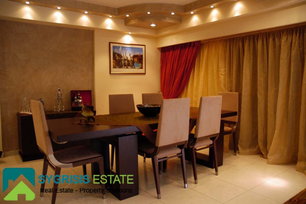 The dining room is located on the ground floor, on a higher level than the rest of the room. The kitchen is on the right and the living room on the left, while it also has a marvelous view to the front yard and the pool.