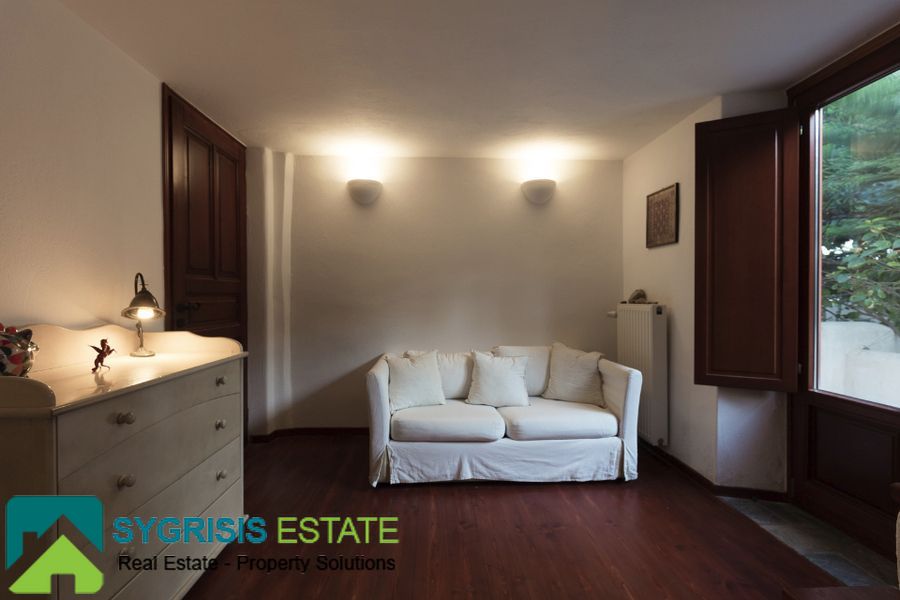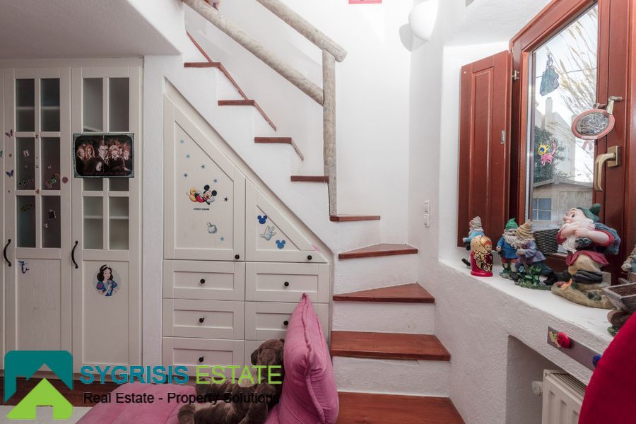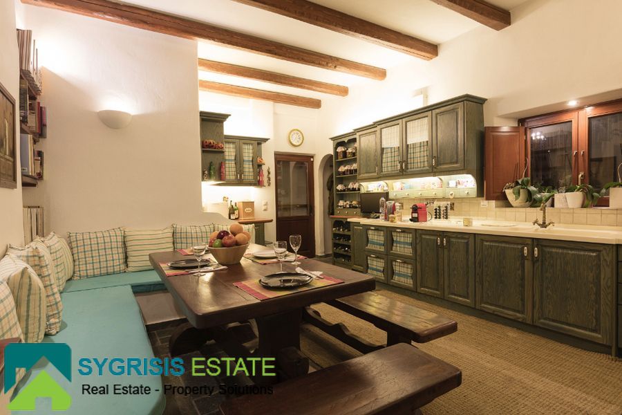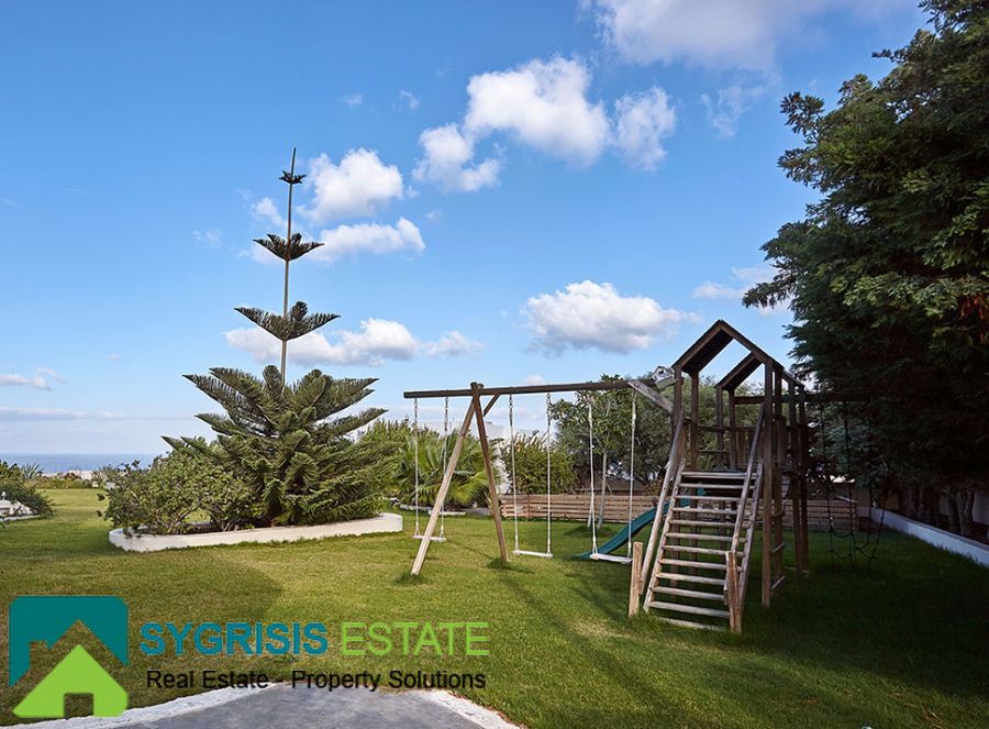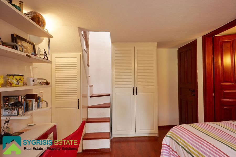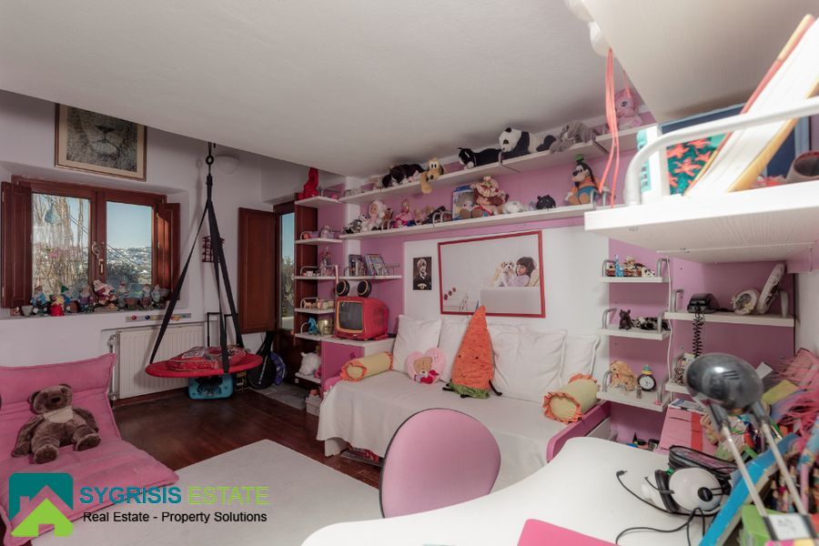 The villa has a total area 450 sq.m. in an excellent location in Karterados Santorini near Fira on plot of 2. 220 sq.m. with remaining future building area. The total area of the house on the land 300 sq.m., while the rest is built lofts with stairs. It is an excellent construction of 2007 with German window frames, external 50 cm thick walls and wooden floors in all bedrooms and living room. Villa has north-east orientation with great unobstructed views of the sea and the town of Fira. It has 6 bedrooms (2 master with its own bathroom and one of them with walk-in closet), a total of 4 bathrooms and 1 wc, large living room with dining area with fireplace and built-in desk and a very large open kitchen with a monastery table for 8 people, very high quality and design bathrooms with a different design and materials each of them, and tiled Karystos stones in the kitchen, the washing-laundry room and a storage room. Features perimeter garden with lawn, pergola, swimming pool with pool-bar in the water, pool seating area, a small traditional church, beautiful garden, barbecue area, playground idoor and oudoor, garden house, wood storage house, borehole from 2 drilled well with excellent water and too many large plants, exquisite unobstructed sea view, Playroom, pantry storage room, laundry room, 2 large warehouses that one could turn in seventh bedroom or guest house, garage 30 sq.m. for 2 cars communicating internally with the house, 2 electric garage doors, radiators installed in all rooms, separate room for the heating system with the burner and tank oil and a small basement.