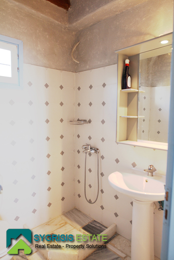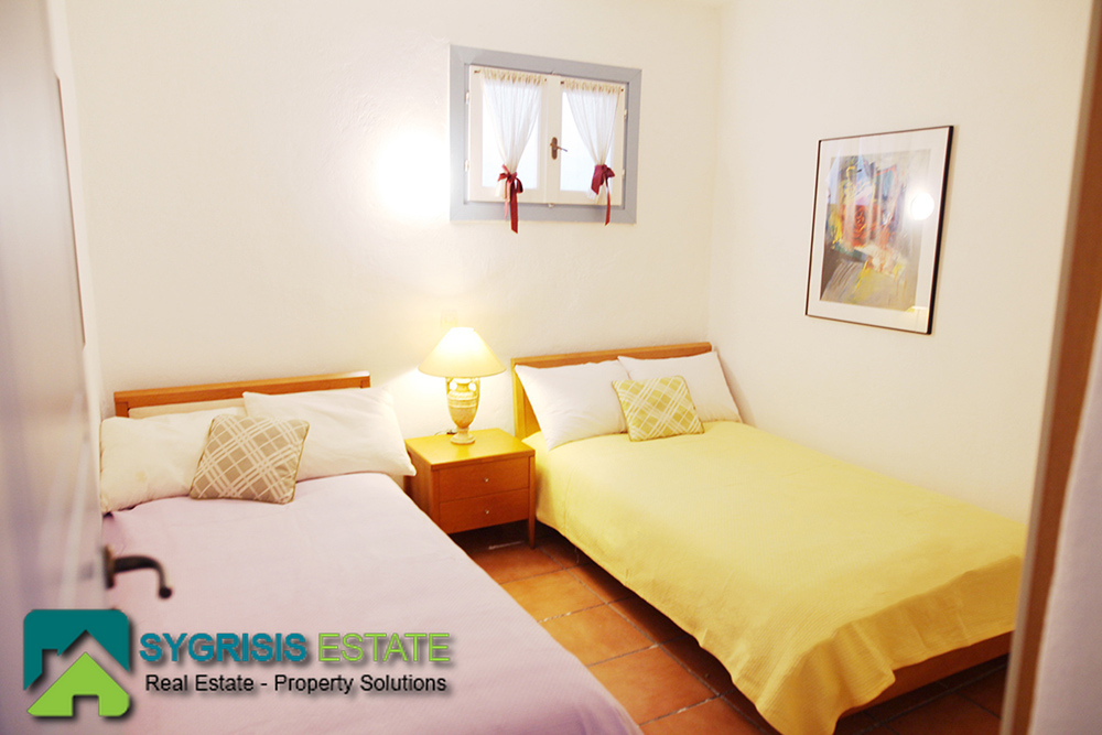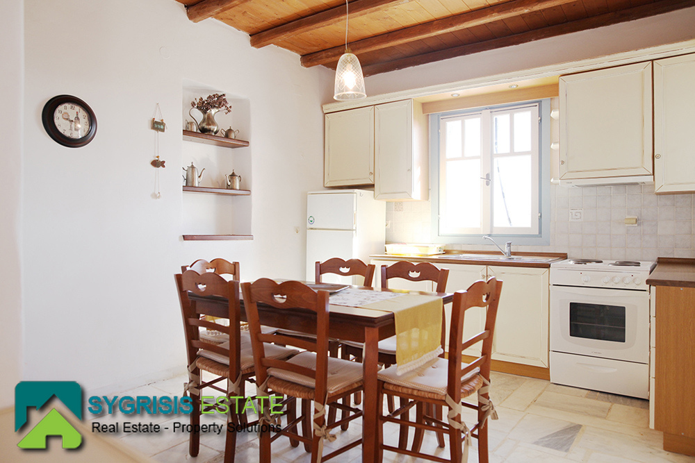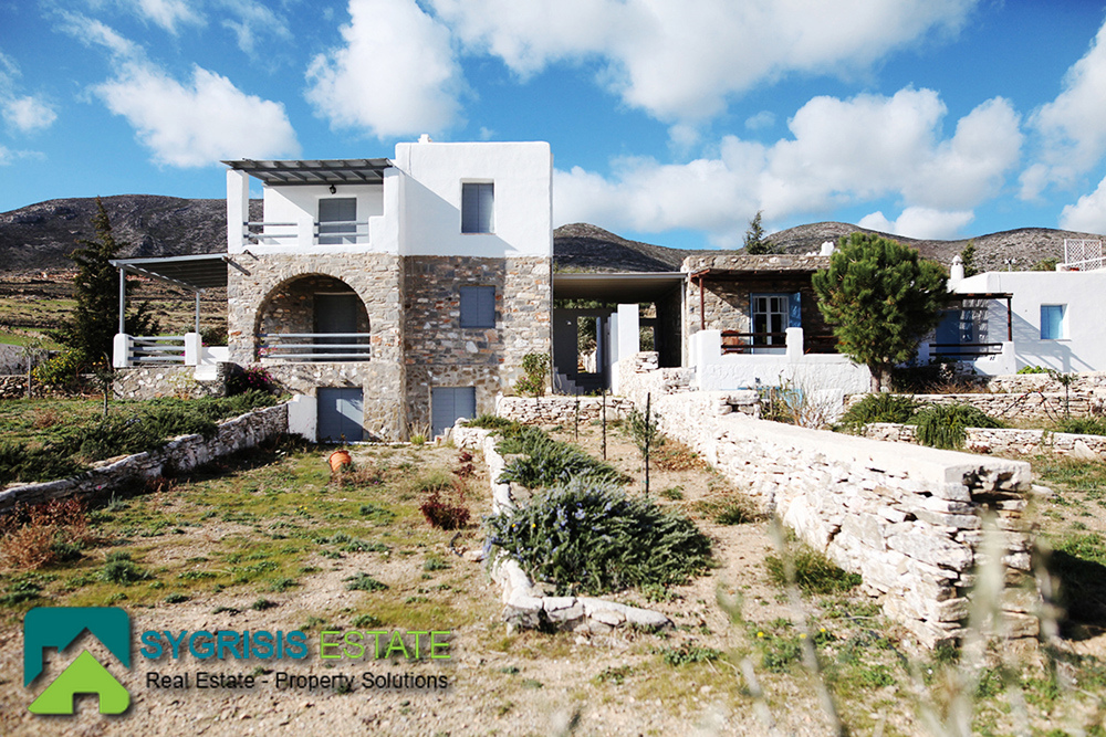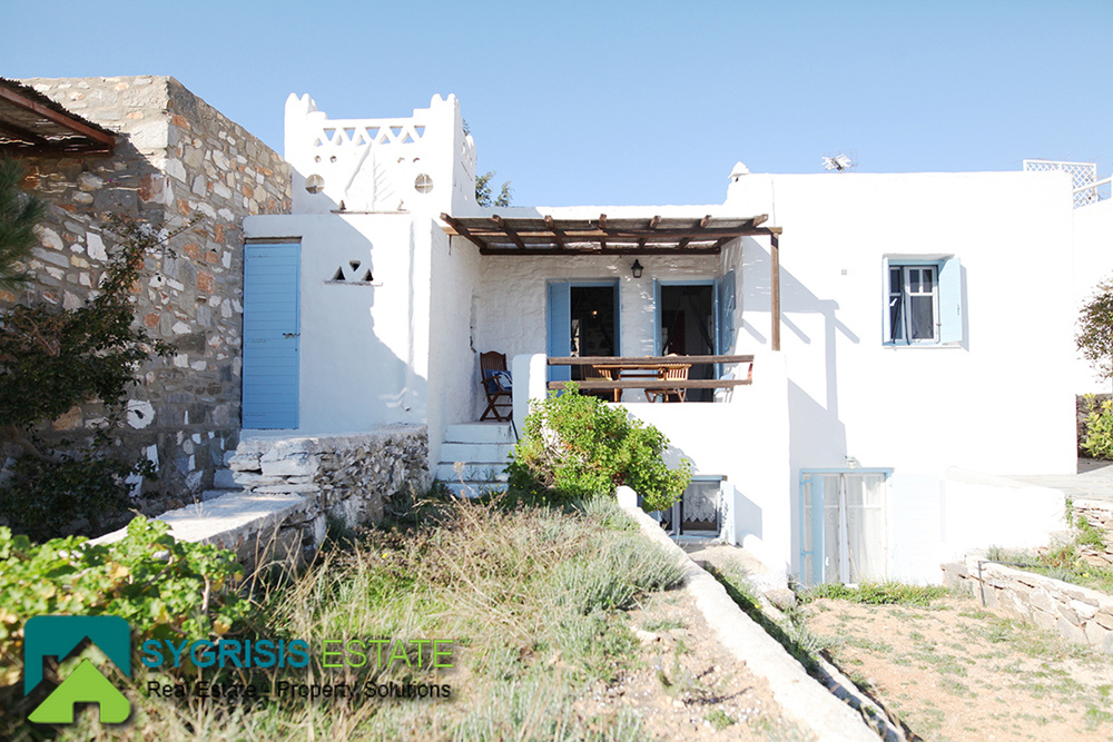 Paros, Tzanes, Chryssi Akti, newly built maisonette of 100 sq.m., built in 2008, 2 levels, traditional, furnished, facade, bright, 3 bedrooms, 2 bathrooms, open-plan kitchen with the living room, autonomous heating, the ground floor consists of kitchen with dining room with living room and 1 bathroom, balconies with pergola, at the lower level there are 3 bedrooms and a bathroom, one bedroom has a window and the other 2 balcony doors with access to the yard. It is located in a complex, mutually independent houses in the area Tzanes Over the Chryssi Akti. The common facilities of the complex are an open parking, a tennis court, and a pool area with Bar and BBQ, from the living room and from the terrace a unique view of the Golden Beach and the Aegean Sea.