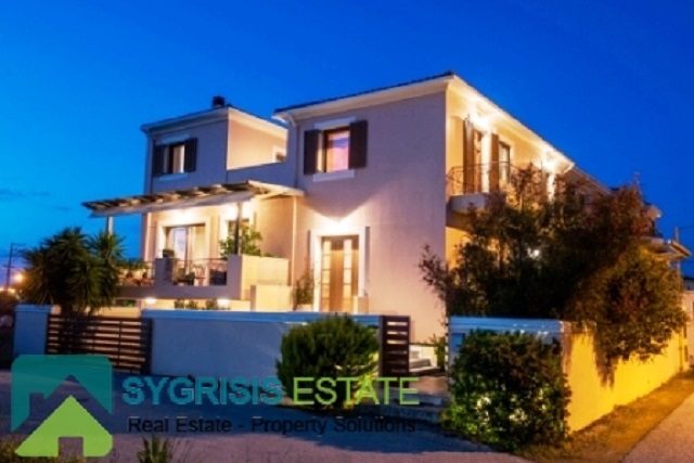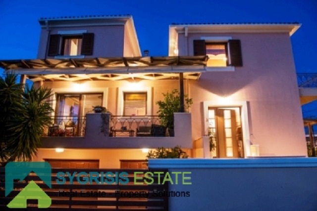 LEFKADA LEFKADA, newly built maisonette of 297 m², 3 levels, Semi-open room 30 m², on a plot of 250 sq.m., basement of 100 m² In which there is a 2 parking spaces, a GYM Room, a boiler room and a warehouse room, a ground floor of 100 m². 1 bedroom with 1 bedroom and 1 bathroom, 1st floor with 3 bedrooms, 1 bathroom with two-speed Jacuzzi, wardrobe room, double glazed aluminum window frames with screens (internorm from Austria), wooden floors( Doussie), autonomous heating, fireplace, security door, solar water-heater, electrically powered awnings, mountain and sea view, storage room 40 m², garden 150 m² with BBQ, the property is 100 meters from the Lefkada Marina, The price is for fully furnished.