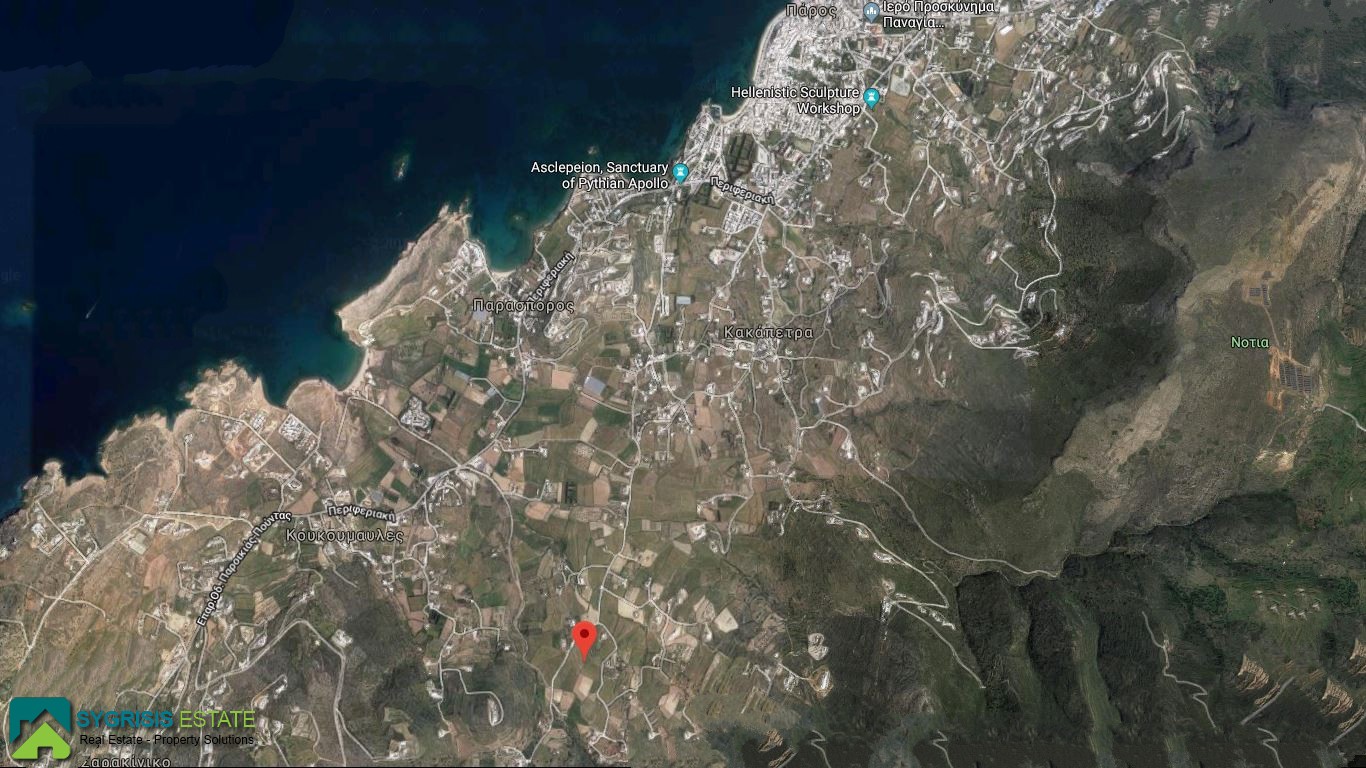 CYCLADES ISLANDS PAROS, Koukoumavles , Plot of 9.390 sq.m., out of plan, level, 2 sides, buildable with permit, builds 280 sq.m, building permit, electric, water lines, 1.500 meters from the sea, unlimited views of  mountain and sea , on an asphalt road near Parasporos and Parikia Town, the property has already topographic, Department of Forest Inspection paper and from the Department of Archaeology, it builds 280 sq. m., has been architecturally designed to cover all square meters of building plot and distance from a Byzantine chapel in to a lower part which has been issued by the Byzantine administration with an official document, all the documents are provided